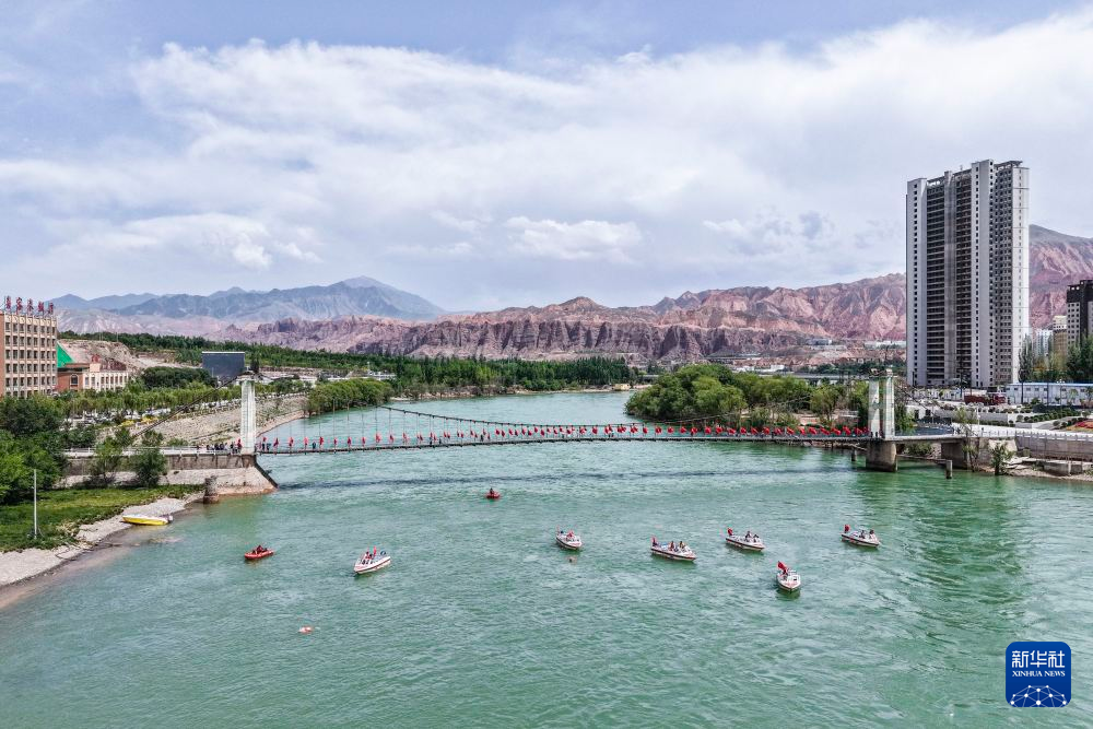 這是6月13日拍攝的第十九屆中國·青海國際搶渡黃河極限挑戰賽循化站賽場(無人機照片)。新華社記者 齊芷玥 攝