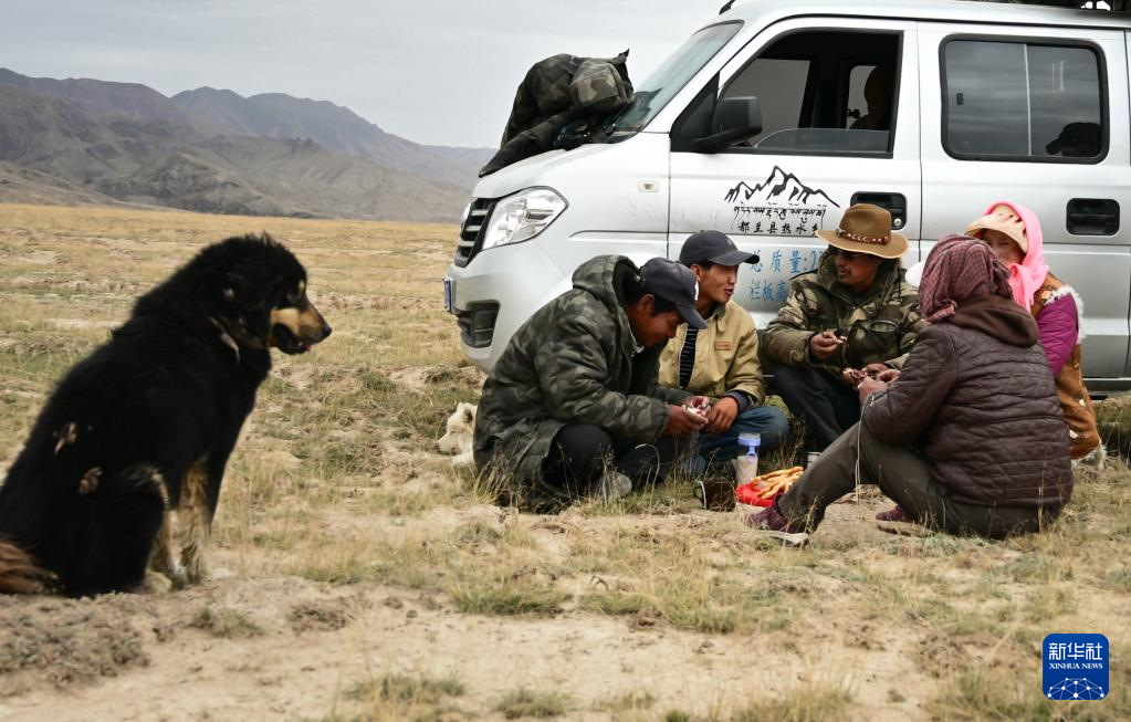 9月9日,在青海省海西蒙古族藏族自治州都蘭縣,牧民龍宮一家人在轉場休息時吃午飯。新華社記者 齊芷玥 攝